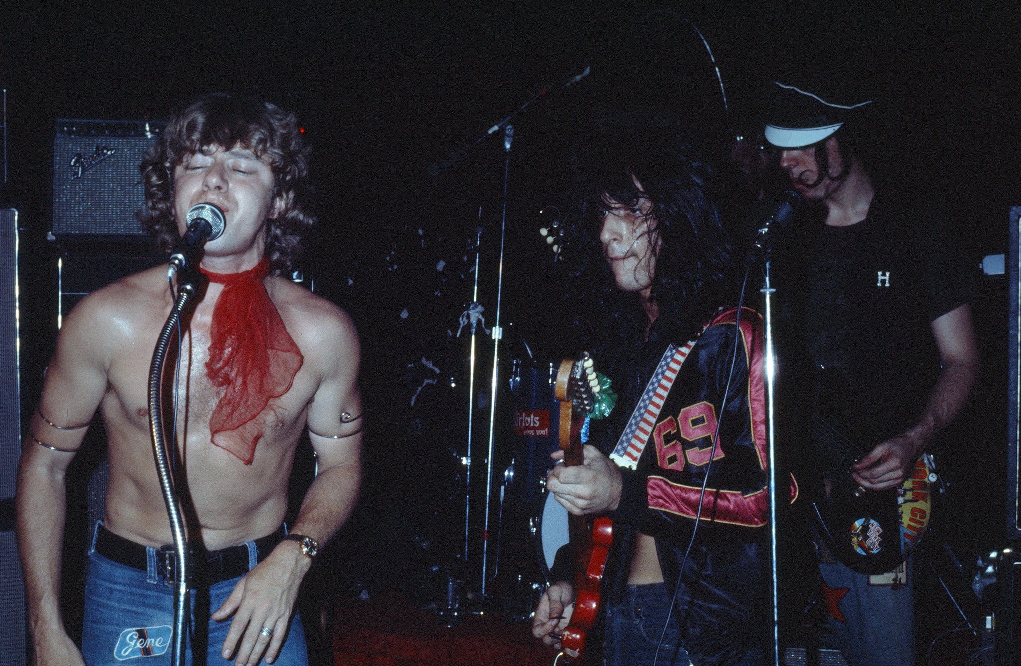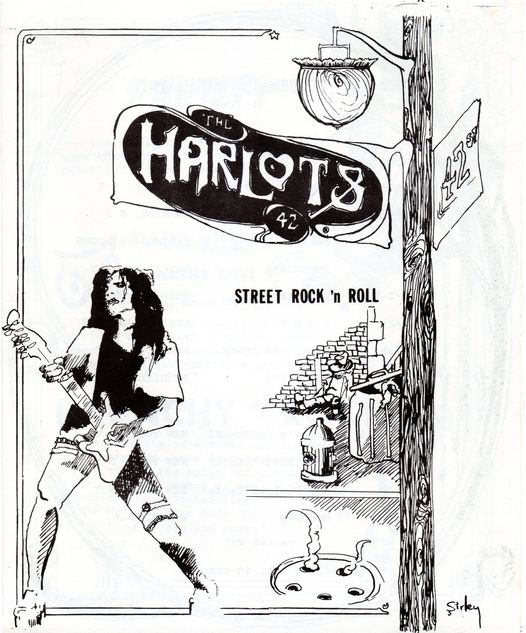 I guess I always loved the junk shop glam bands because they reminded me of when my own merry bands of post-punk weirdos were all still struttin’ down the boardwalk in our raggle taggle feathers and sequins, a stylist free spectacle rocky horror show to behold, all cheap as fuck, but tarted up to the max-one guy looked like Dee Snider in makeup, one looked like a chick, me in my best Pete Burns kabuki and fishnets and platform shoes and foot and a half high severely Aqua Netted Steve Stevens hair, a guitarist who looked like the Love Reaction, a cowboy heartthrob Marlboro Man on bass guitar, a skinhead drummer in perfectly immaculate and well ironed and polished creepers and braces, flight jacket and wifebeater and dogatgs and rolledup jeans uniform–we were some ragtag ruffians, somebody once said a cross between Turbonegro and the Village People. My first band was called Harlot and I remember reading about the Harlots of 42nd Street and Eric Emerson and the Magic Tramps in some early Blondie bio I checked out of the public library as a young teen-probably the one by Lester Bangs, but I’m not positive. Anyhows, I’ve always been on the look out for some Harlots relic and just found out Sundazed records has an unearthed album available!